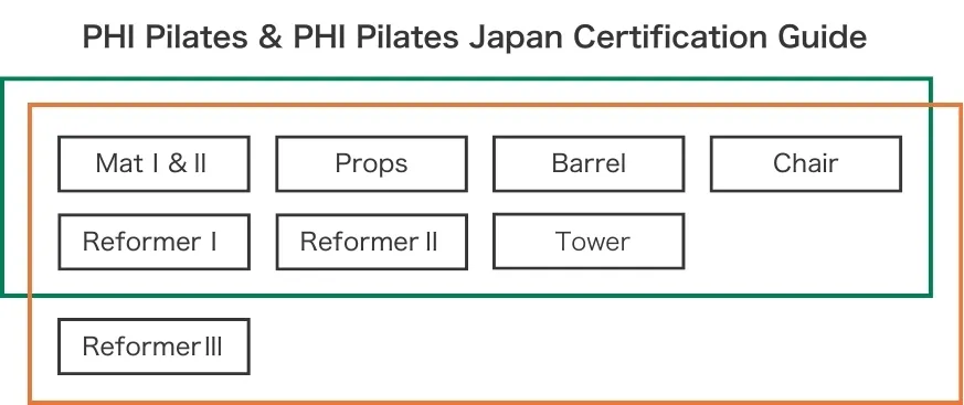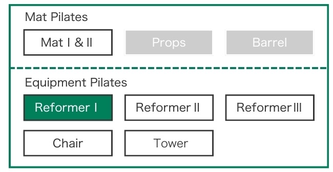 若是從「Reformer Ⅰ(器械Ⅰ)」課程開始的學員,則可繼續修習「Reformer Ⅱ、Ⅲ」、「Tower(半高架核心床)」、「Chair(椅)」等課程,但無法報名「Props(輔具)」與「Barrel(桶)」課程。(若從 Reformer Ⅰ 開始的學員之後完成 Mat Ⅰ&Ⅱ,也可再報名 Props 與 Barrel。)